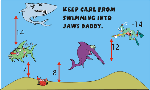Carl is diving in the Great Barrier Reef off the coast of Australia. These waters are shark-infested. Keep Carl safe by determining how many feet below sea level Jaws Daddy is swimming.