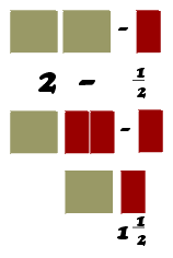 | Borrow from the whole number when needed. Convert the ONE that was borrowed into an equivalent fraction with the same denominator as the fraction doing the subtracting. If there is already a fraction attached to the number, add the ONE onto it. |